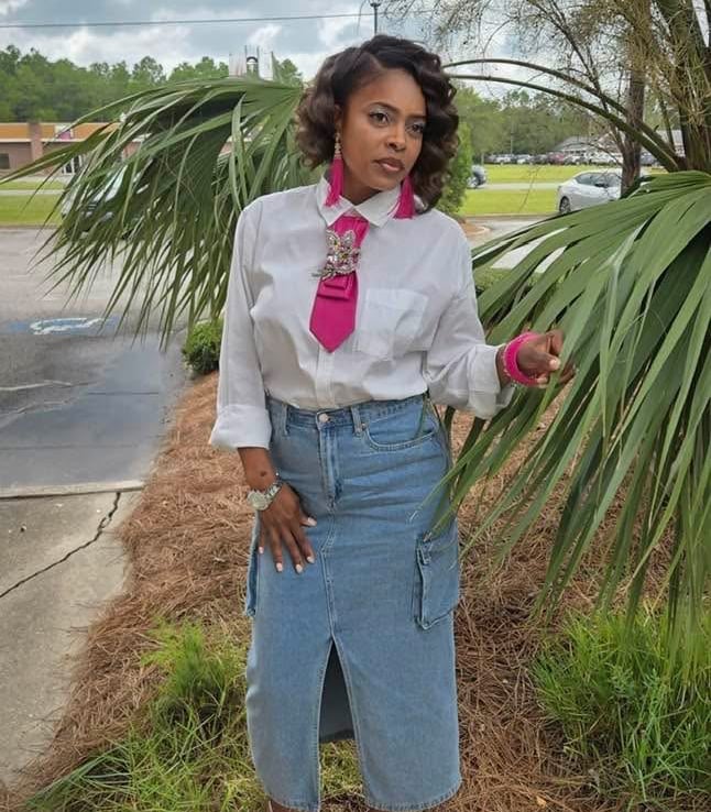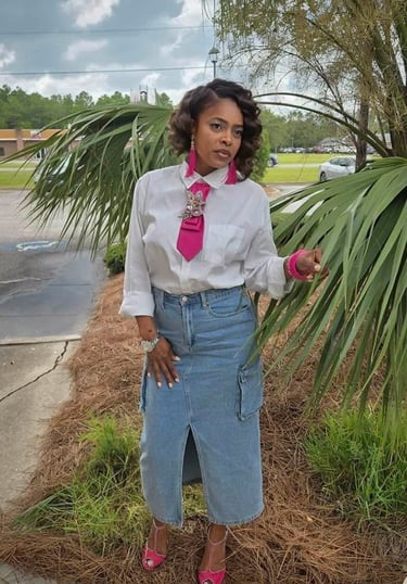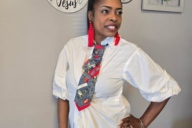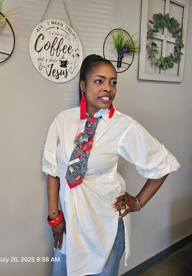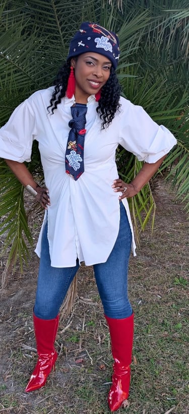 Where bold style meets fearless expression. The Slaybook is a living gallery of our fiercest clients rocking their one-of-a-kind All Tie’D Up pieces custom-designed by Michelle Wilson. From denim statements to brooch brilliance, each photo showcases unapologetic confidence, creative elegance, and the power of personalized fashion. This isn’t just a lookbook — it’s a movement.