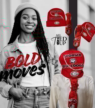 ...Turn heads in the stands and beyond with Michelle Wilson’s exclusive Game Day Couture collection. Featuring custom-designed "team spirit" ties paired with pearl-draped beanies, these looks blend sporty pride with signature elegance. Whether you're cheering from the sidelines or walking into your next meeting, it's time to rep your team — the All Tied Up way.